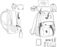 • Fleecem vystlaná kapsa na brýle a podobně choulostivé věci, dvě hlavní prostorná oddělení, kapsa na tablet, vypolstrovaná kapsa na 17" notebook, popruh na nesení skateboardu, postranní kapsa na zip, postranní síťovinová kapsa na lahev.