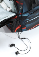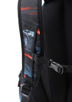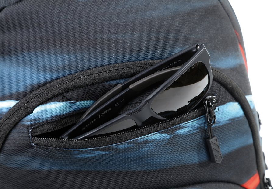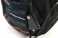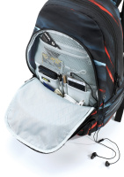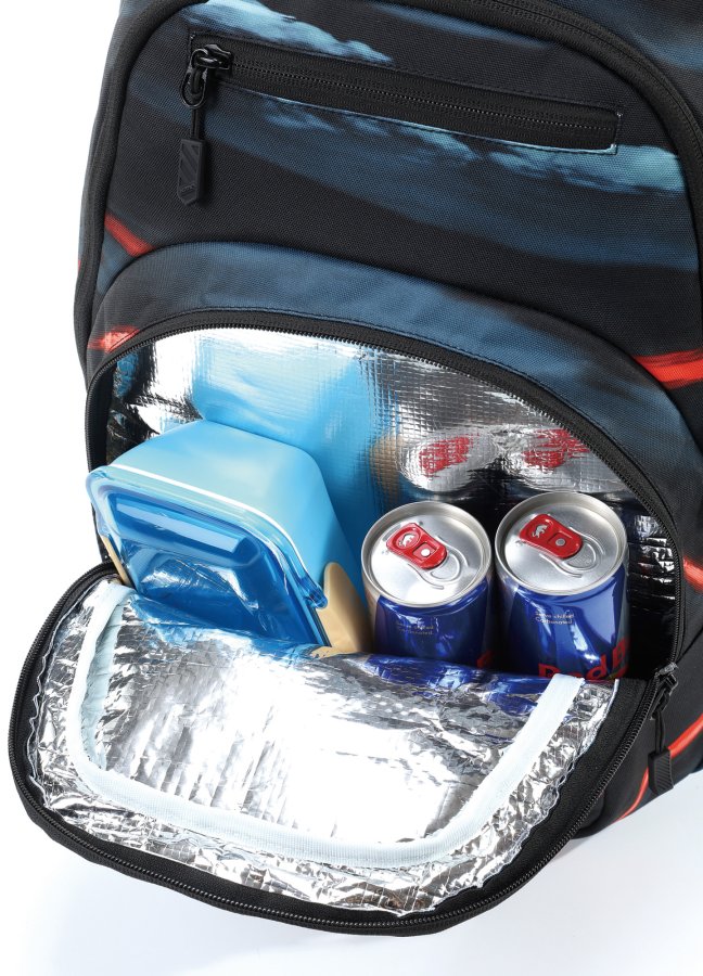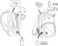 • Vypolstrovaná kapsa na 15" notebook, fleecem vystlaná kapsa na brýle a podobně choulostivé věci, průchodka na sluchátka, organizér, přední termoizolační kapsa co zachová studené pití, postranní síťka na lahev.