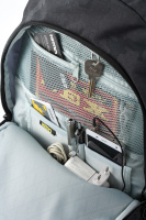 • Vypolstrovaná kapsa na 15" notebook, fleecem vystlaná kapsa na brýle a podobně choulostivé věci, průchodka na sluchátka, organizér, přední termoizolační kapsa co zachová studené pití, postranní síťka na lahev.