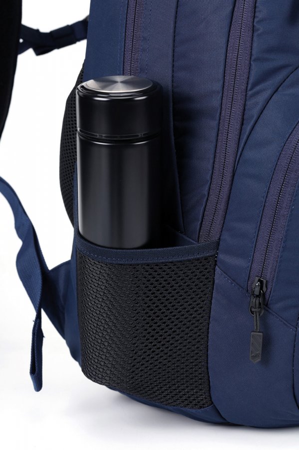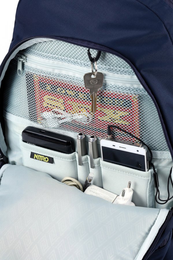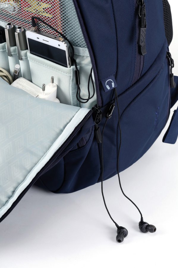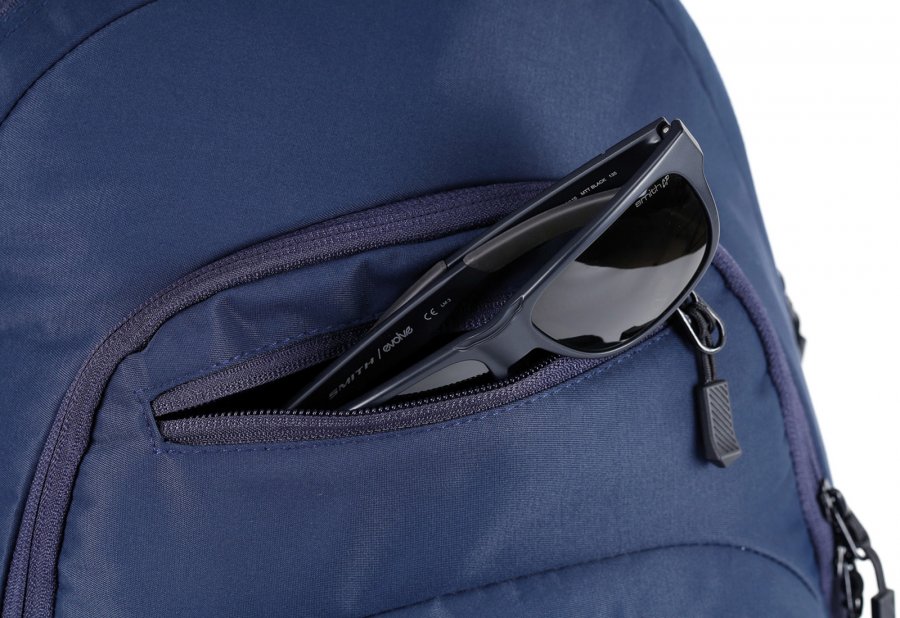 • Vypolstrovaná kapsa na 15" notebook, fleecem vystlaná kapsa na brýle a podobně choulostivé věci, průchodka na sluchátka, organizér, přední termoizolační kapsa co zachová studené pití, postranní síťka na lahev.