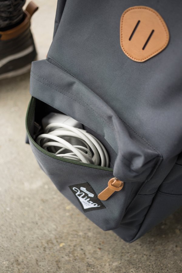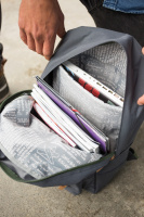 Batoh s pohodlnými polstrovanými popruhy, přední kapsou na zip, polstrovanou kapsou na 15" notebook a doplňky z veganské kůže.