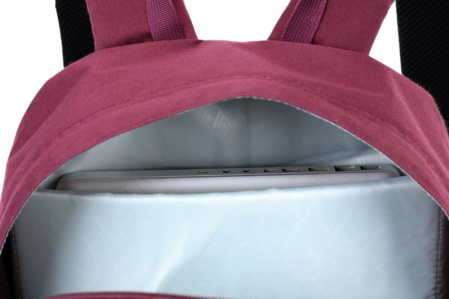 Batoh s pohodlnými polstrovanými popruhy, přední kapsou na zip, polstrovanou kapsou na 15" notebook a doplňky z veganské kůže.