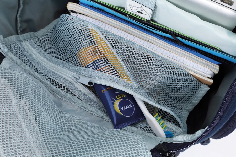 Fleecem vystlaná kapsa na brýle a podobně choulostivé věci, vypolstrovaná kapsa na 15" notebook, vnitřní kapsa na kabely a nabíječky, prostorná přední kapsa s organizérem.