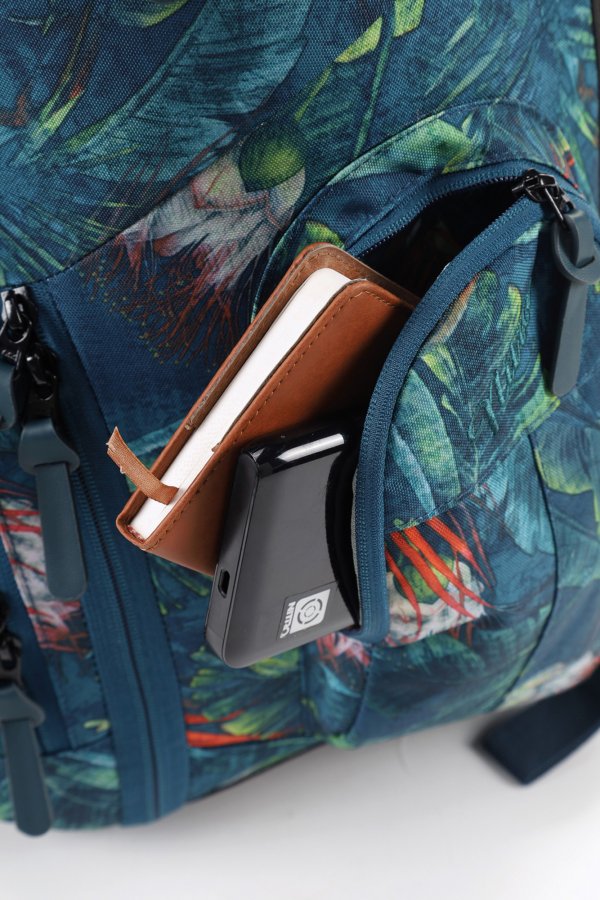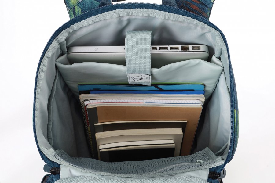 Fleecem vystlaná kapsa na brýle a podobně choulostivé věci, vypolstrovaná kapsa na 15" notebook, vnitřní kapsa na kabely a nabíječky, prostorná přední kapsa s organizérem.
