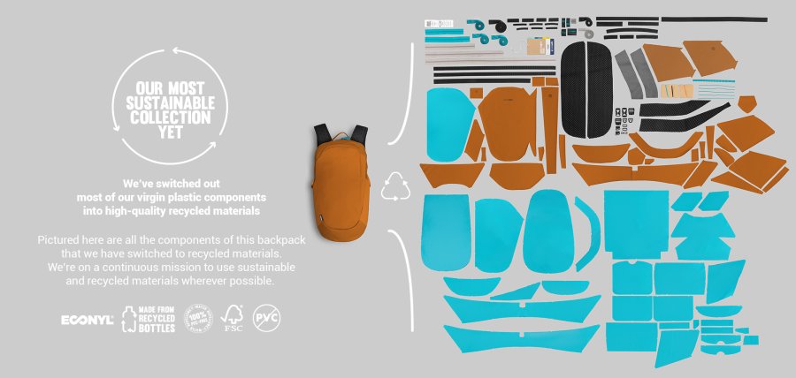 Hlavní popruh lze upevnit tak, aby vyhovoval levákům i pravákům. Minimalizaci pohybu batohu kolem těla umožňuje tříbodové uchycení popruhů na batoh. Vyrobeno ze 7 recyklovaných plastových lahví, které byly použity na podšívku, síťovinu, popruhy a štítky. Vnější tkanina byla vyrobena z regenerovaného nylonu ECONYL, který pochází z odpadu vydaného moři, jako jsou vyřazené rybářské sítě, zbytky látek, koberce a průmyslové plasty. Oddělená kapsa na hydratační vak. Další 2 velké kapsy na láhev s vodou. Prostor pro 11palcový tablet. Vnitřní úchytné očko pro peněženky a klíče. Další kapsy pro snadné přehledné uložení vašich potřeb. Chytré zabezpečení zipu a proříznutí odolné materiály chrání vaše věci. Kotvící popruh odolný proti proříznutí připoutá batohbezpečně k topení, stolu nebo zábradlí. Kapsa s blokováním RFID chrání vaše kreditní karty a cestovní pas před nechtěným skenováním.