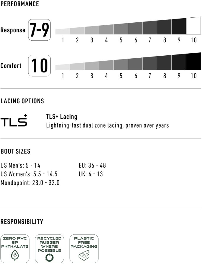 • Nová generace dvoustupňového systému utahování tkaniček TLS PowerCord má inovovaný, odolný zámek, speciálně designovaný tak, aby v něm tkaničky pevně držely a nepovolily ani po celodenní palbě.