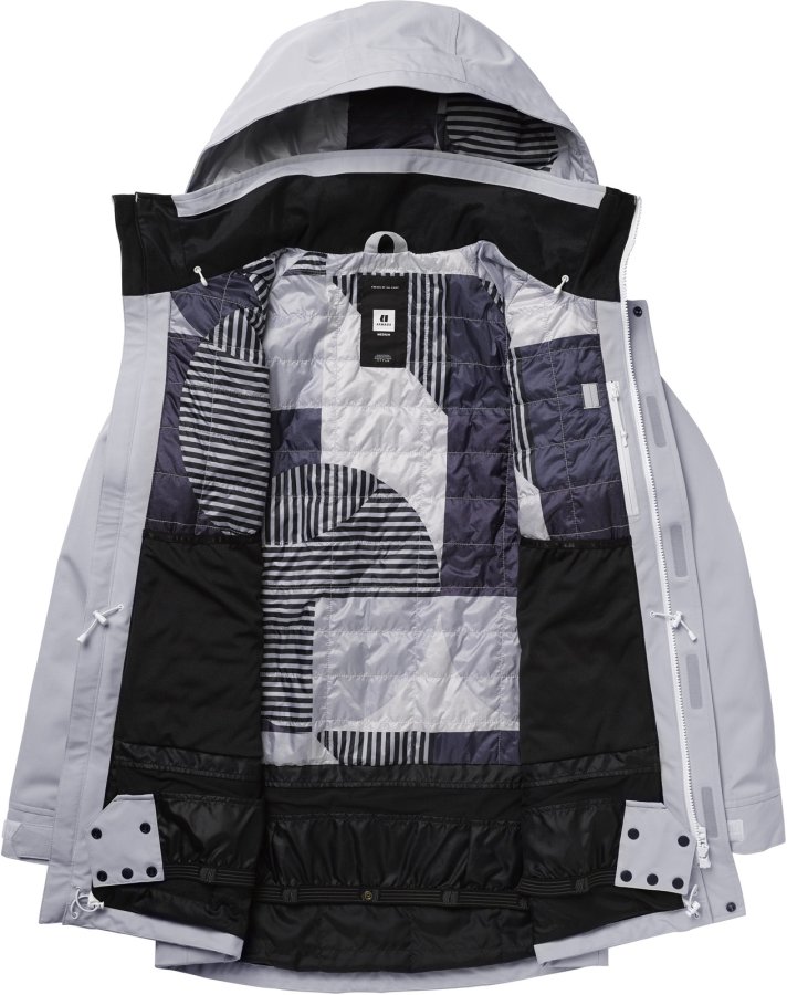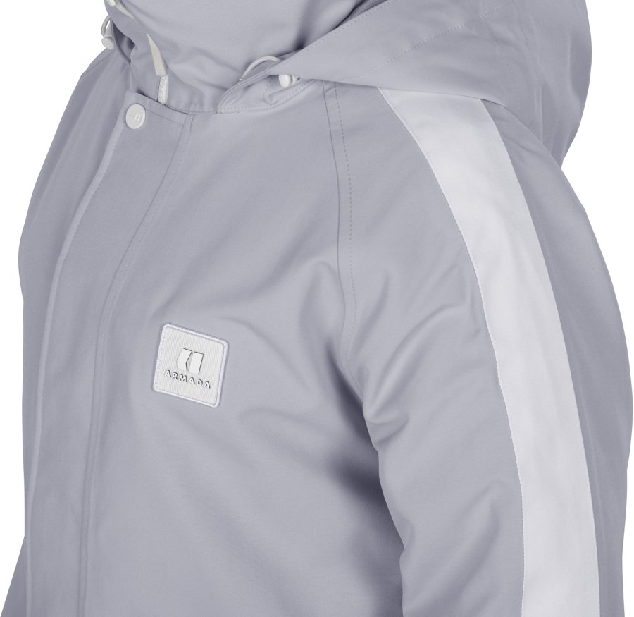 Bunda standardního střihu má odvětrávací zipy v podpaží, patentní utahování na spodním lemu a u kapuce, kvalitní YKK zipy, měkké lycrové rukávky s očkem na palec, microfleecem krytou oblast tváře a zateplené kapsy.
