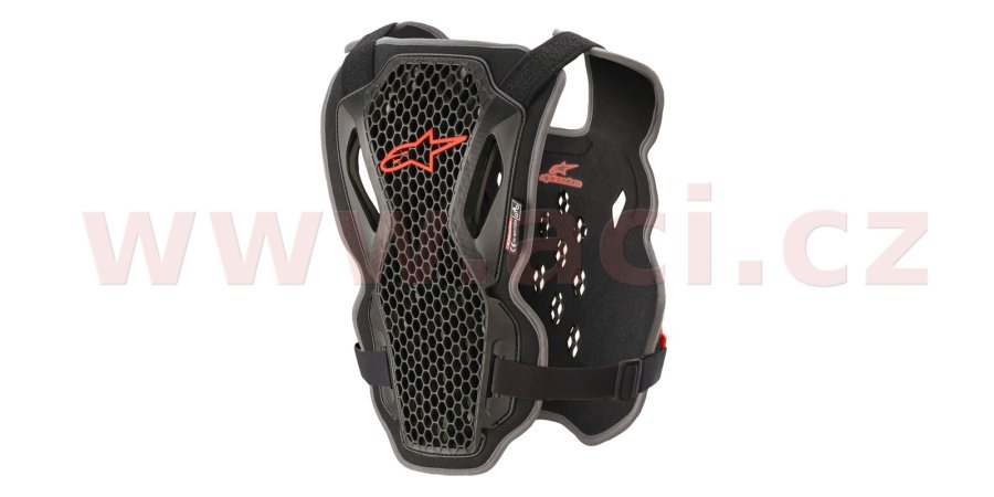 Pružné, nastavitelné ramenní popruhy s komfortním polstrováním a boční pružné, nastavitelné popruhy fixují protektor na těle v potřebné pozici.
