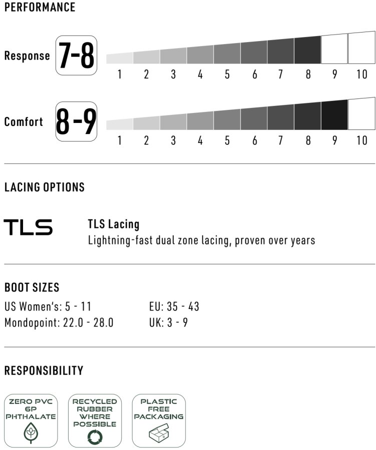 Nechybí spolehlivé TLS Twin šněrování se kterým se nazuješ a vyzuješ za míň jak 60 sekund a ILS šněrování vnitřní botky s Re/Lace utahováním pro jednoduché dotažení za pochodu.