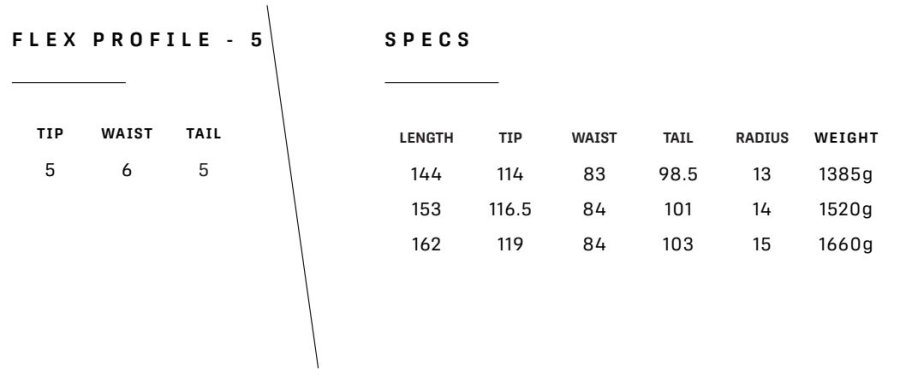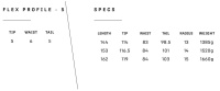 • Parametry lyže při délce: 144 cm: 114 / 83 / 98,5 mm, radius 13 m, hmotnost jedné lyže 1 385 g; 153 cm: 116,5 / 84 / 101 mm, radius 14 m, hmotnost jedné lyže 1 520 g; 162 cm: 119 / 84 / 103 mm, radius 15 m, hmotnost jedné lyže 1 660 g.