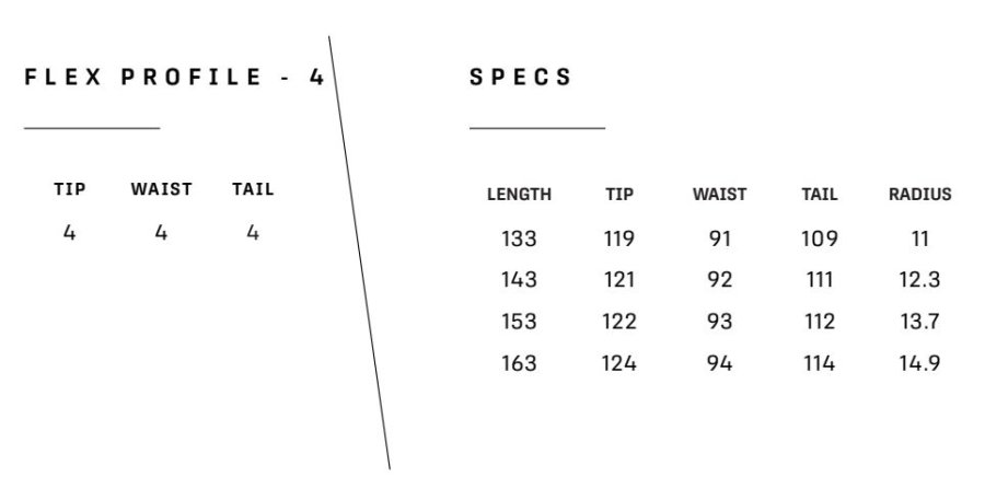 Parametry lyže při délce: 133 cm: 119 / 91 / 109 mm, radius 11 m; 143 cm: 121 / 92 / 111 mm, radius 12,3 m; 153 cm: 122 / 93 / 112 mm, radius 13,7 m; 163 cm: 124 / 94 / 114 mm, radius 14,9 m.