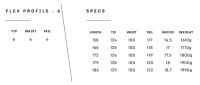Parametry lyže při délce 158 cm: 124 / 100 / 117 mm, radius 16.5 m, hmotnost jedné lyže 1 610 g; 165 cm: 125 / 100 / 118 mm, radius 17 m, hmotnost jedné lyže 1 710 g; 172 cm: 126 / 100 / 119 mm, radius 17.5 m, hmotnost jedné lyže 1 800 g; 179 cm: 128 / 100 / 120 mm, radius 18 m, hmotnost jedné lyže 1 900 g; 186 cm: 130 / 100 /122 mm, radius 18.5 m, hmotnost jedné lyže 1 990 g.