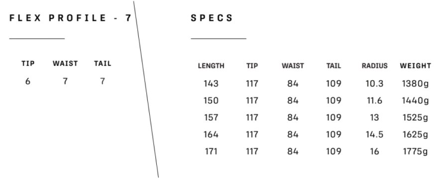 • Parametry lyže při délce 143 cm: 117 / 84 / 109 mm, radius 10,3 m, hmotnost jedné lyže 1 440 g; 150 cm: 117 / 84 / 109 mm, radius 11,6 m, hmotnost jedné lyže 1 440 g, 157 cm: 117 / 84 / 109 mm, radius 13 m, hmotnost jedné lyže 1 525 g; 164 cm: 117 / 84 / 109 mm, radius 14,4 m, hmotnost jedné lyže 1 625 g; 171 cm: 117 / 84 / 109 mm, radius 16 m, hmotnost jedné lyže 1 775 g.