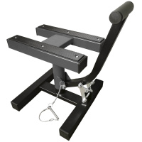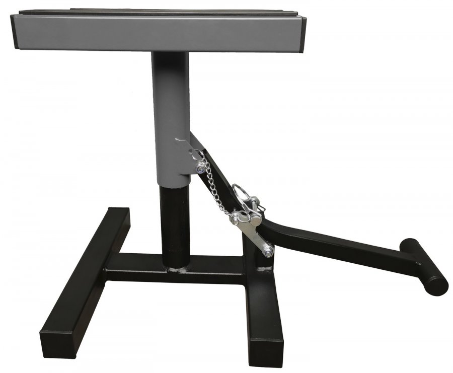 Stojan z ocelových profilů 3 mm gumová ochrana svrchní plochy o rozměru 29 x 19 cm Trn pro zajištění stojanu ve zdvižené poloze hmotnost: 5,6 kg min. výška: 28 cm max. výška: 40 cm nosnost do 150 kg není vhodné pro čtyřkolky Celý popis