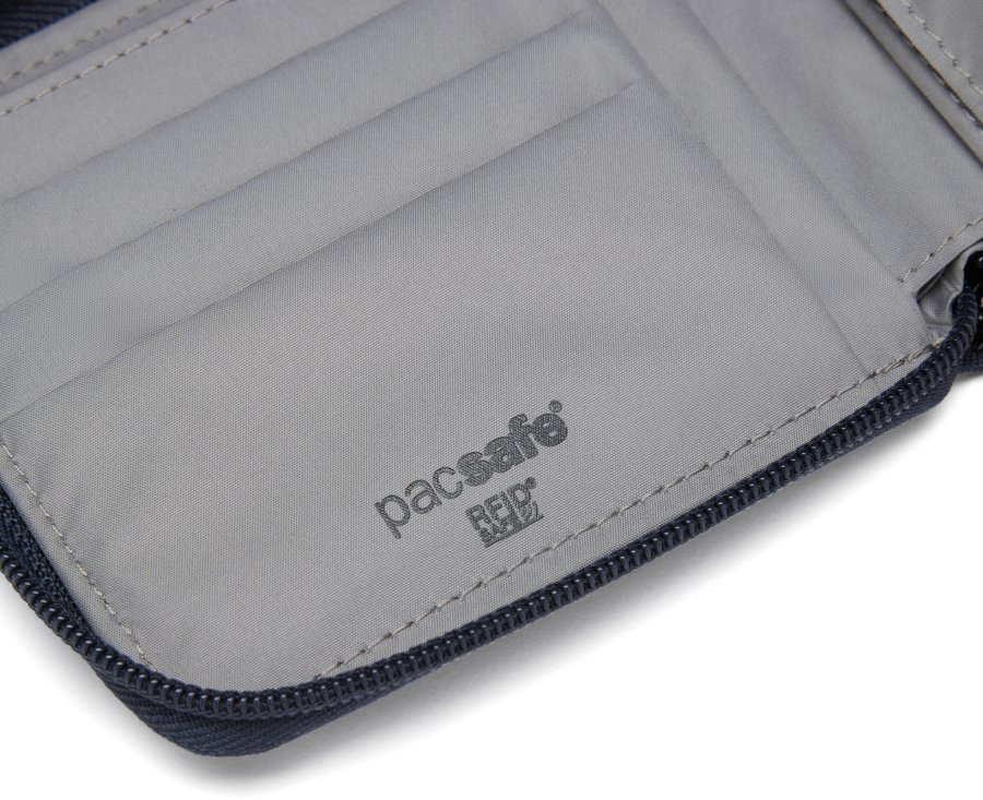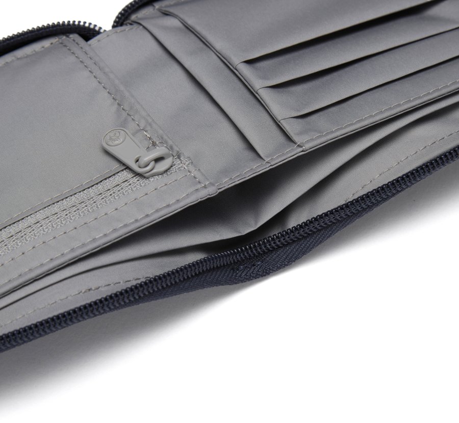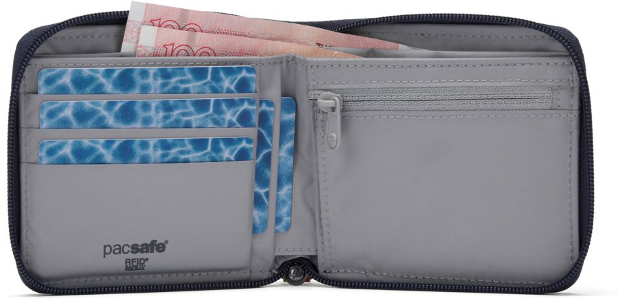 Z téhle peněženky se nic bez vašeho svolení nedostane! Postará se o to zip po celém obvodu a materiál chránící vaše informace z dokladů a kreditek před nežádoucím skenováním signálu RFID.