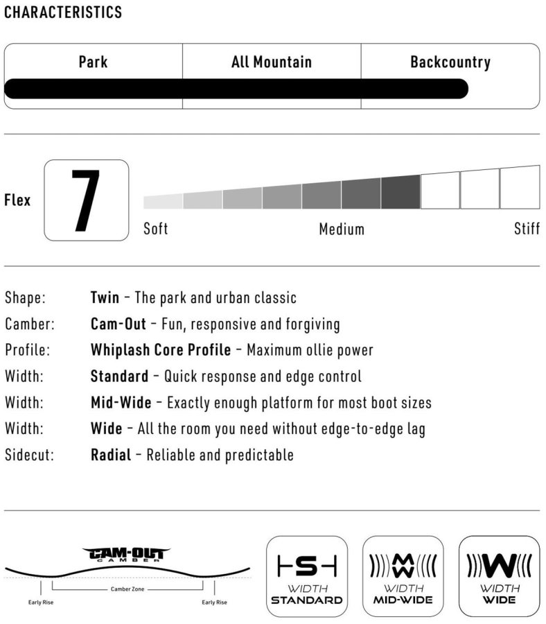Tenhle parkový šampion vyhrál více cen, než kterýkoliv jiný freestyle snowboard na světě. Osvědčila se hlavně jeho odolnost a perfektní výkon. Legendární freestylová deska prošla za ty roky několika úpravami, na kterých se podíleli teamoví jezdci , takže se můžeš těšit na dokonalý nástroj.