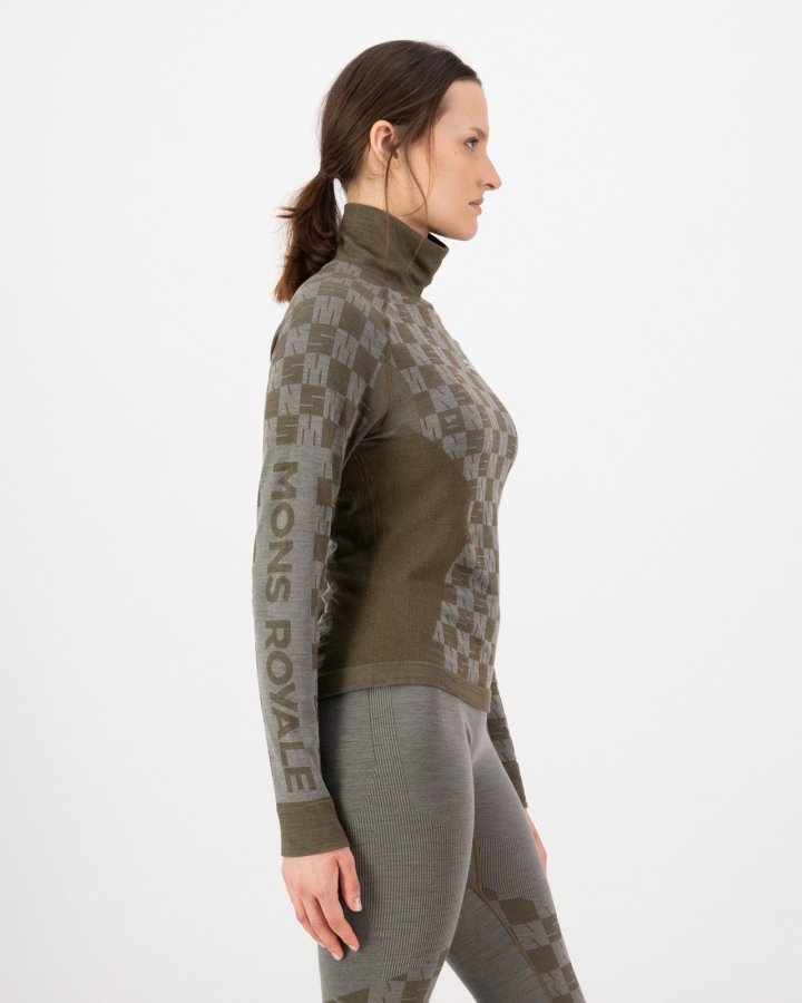 dámské triko Mons Royale Ascender merino mock neck LS wmns dried sage / dark olive